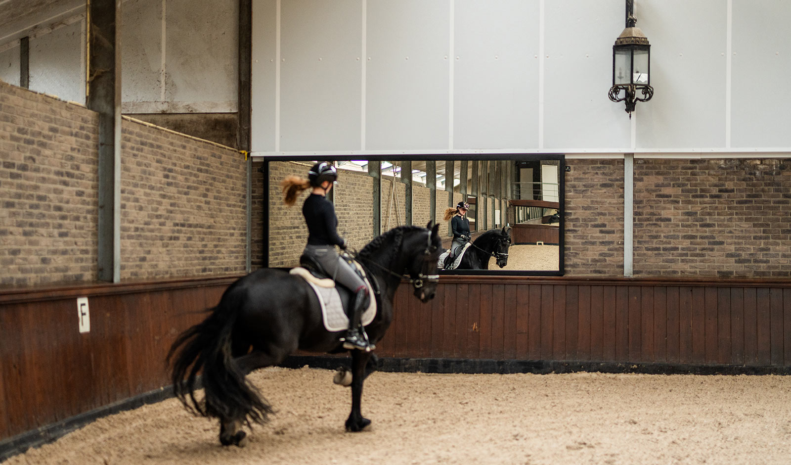 Voor deze binnenbak in Vijfhuizen realiseerden wij een EasyFix manegespiegel die volledig op maat is gemaakt voor de bestaande situatie. De klant zocht een strakke spiegeloplossing die perfect aansluit op de gemetselde achterwand en visueel volledig opgaat in de hal.